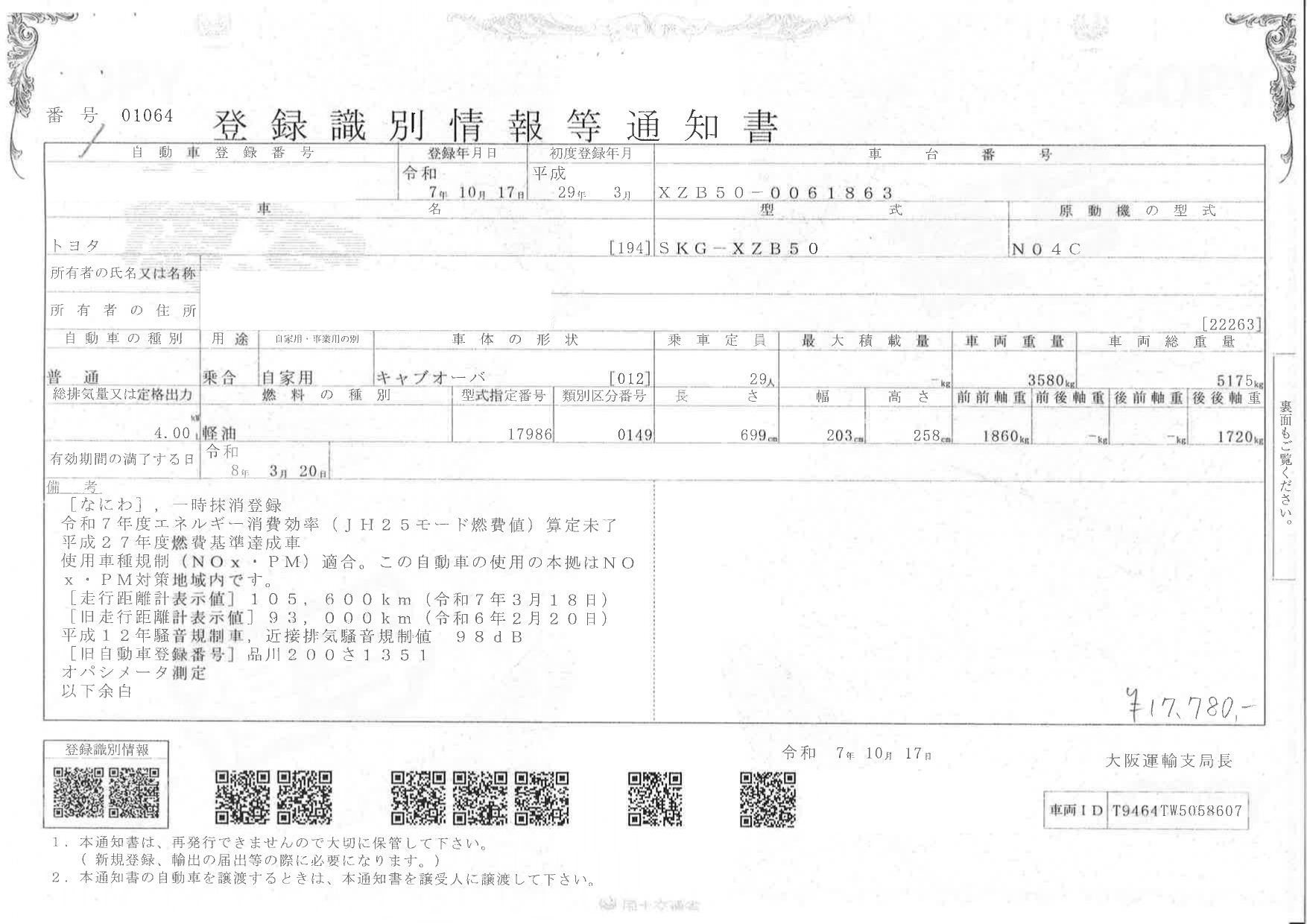 | 車両整理番号 | 3711002 | 初年度登録年月 | 平成29年3月 | 型式・車体番号 | SKG-XZB50-0061863 |