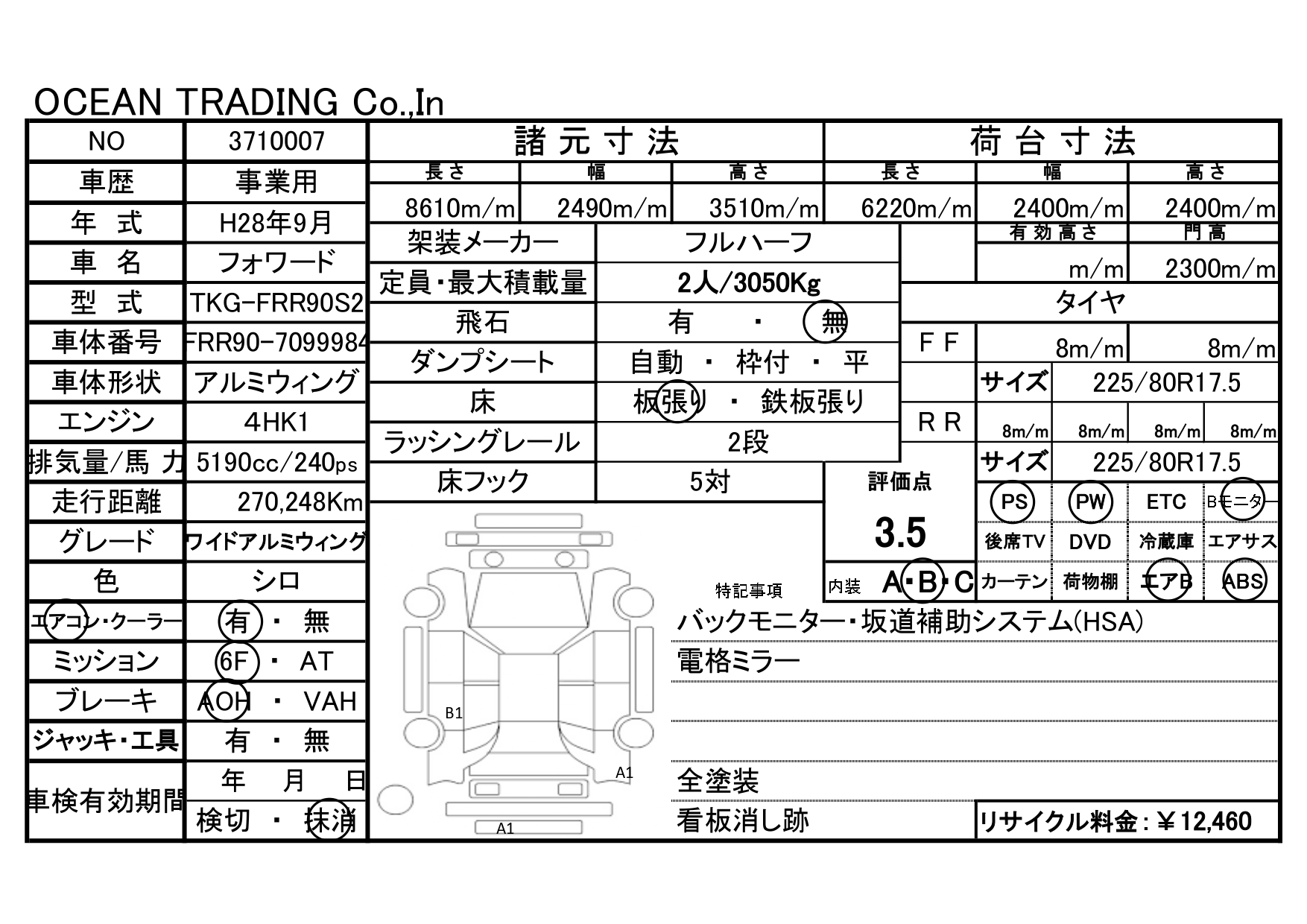 | 車両整理番号 | 3710009 | 初年度登録年月 | 平成28年9月 | 型式・車体番号 | TKG-FRR90S2-7099984 |