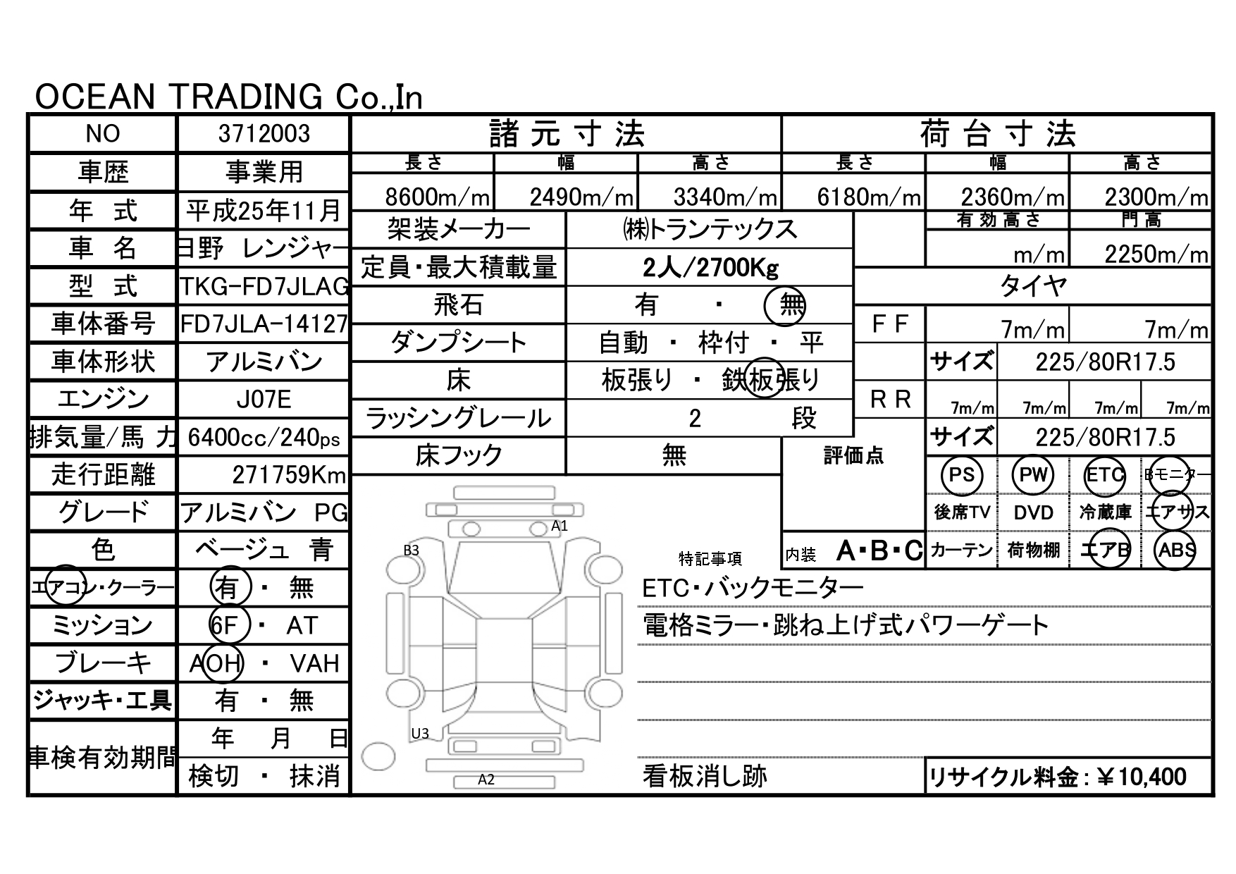 | 装備・仕様 | ETC・バックモニター・跳ね上げ式パワーゲート・エアサス・ラッシングレール2段・荷台寸法:長618幅236高230(㎝) | リサイクル預託金 | 10,400円 | 備考 | 看板消し跡 |