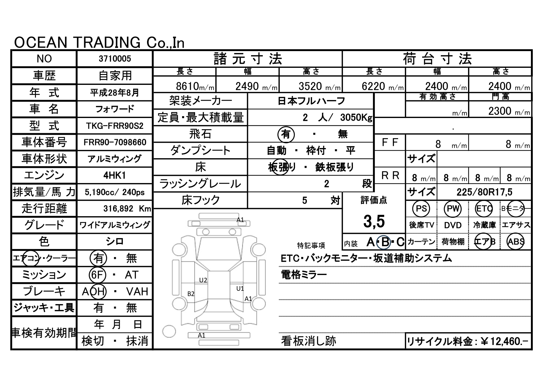 | 装備・仕様 | ETC・バックモニター・電格ミラー・坂道補助システム・床フック5対 ・ラッシングレール2段・荷台寸法:L622 W240 H240(㎝) | リサイクル預託金 | 12,460円 | 備考 | 看板消し跡 |