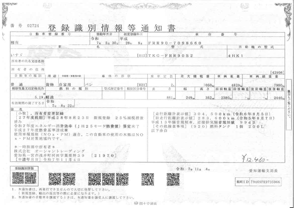 | 車両整理番号 | 3710005 | 初年度登録年月 | 平成28年8月 | 型式・車体番号 | TKG-FRR90S2-7098660 |