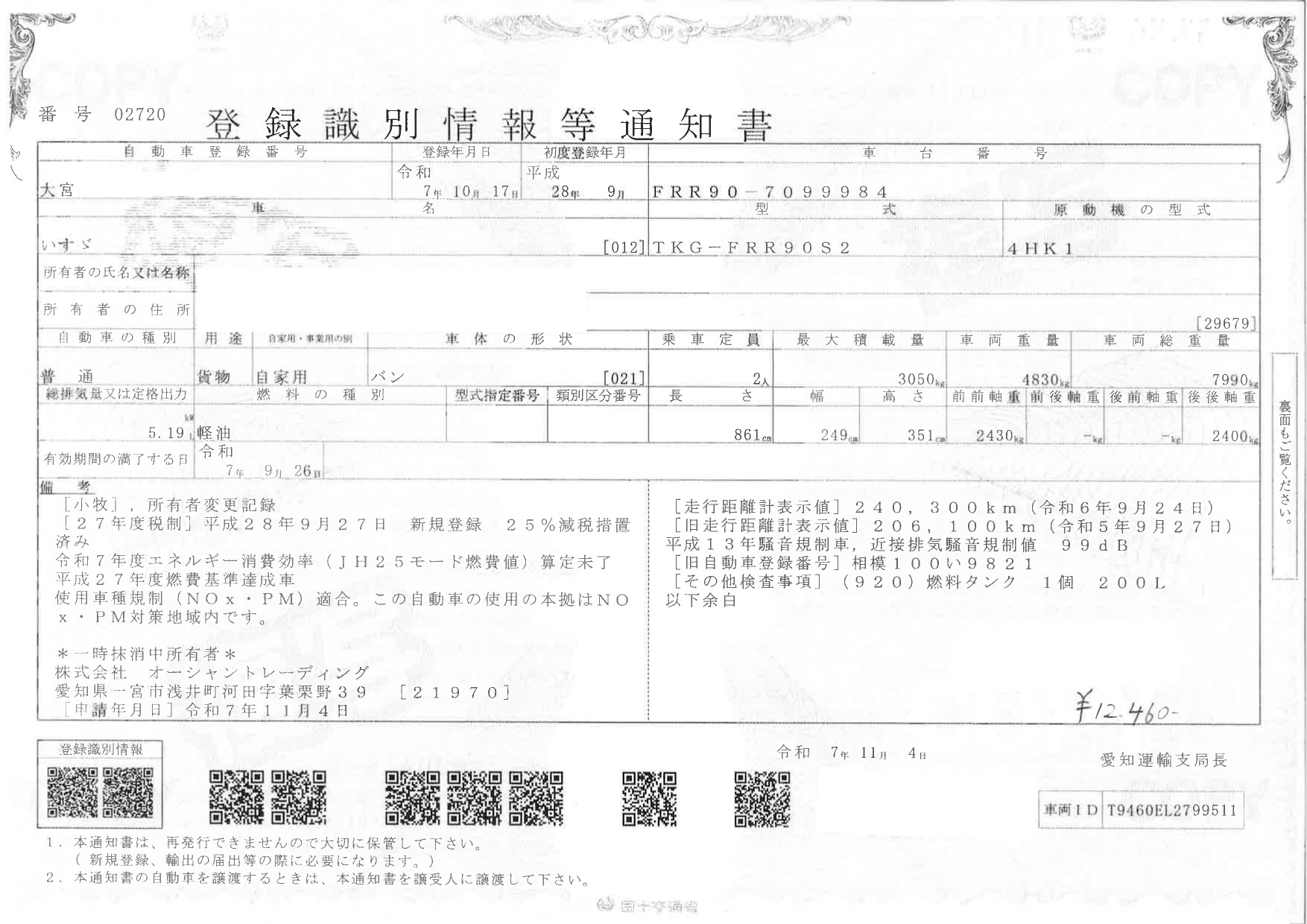 | 車両整理番号 | 3710009 | 初年度登録年月 | 平成28年9月 | 型式・車体番号 | TKG-FRR90S2-7099984 |